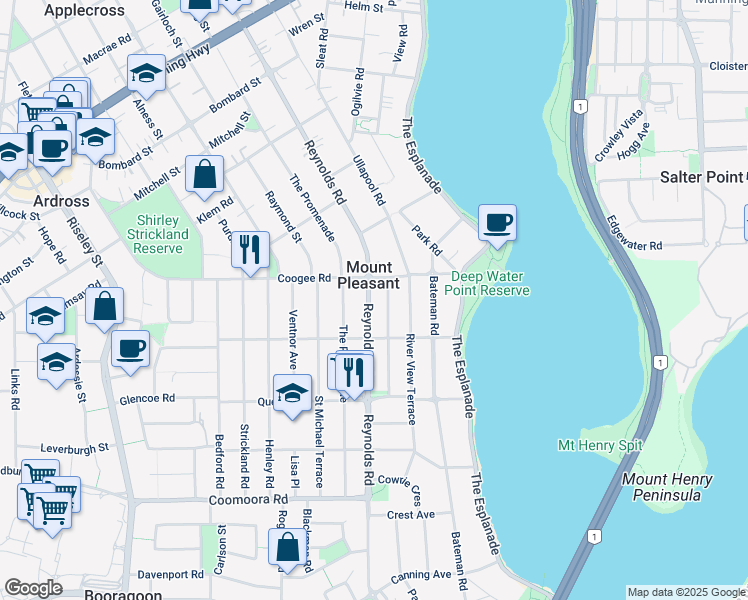 This location is in the Mount Pleasant neighborhood in Perth. Nearby parks include Deep Water Point Reserve, Harry Bridie Reserve and Jim Ainsworth Reserve.