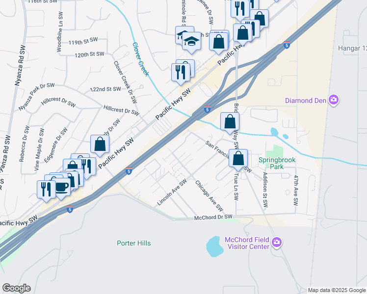 12537 Springbrook Lane Southwest is a 20 minute walk from the S Line Seattle - Tacoma/Lakewood at the Lakewood Station stop.