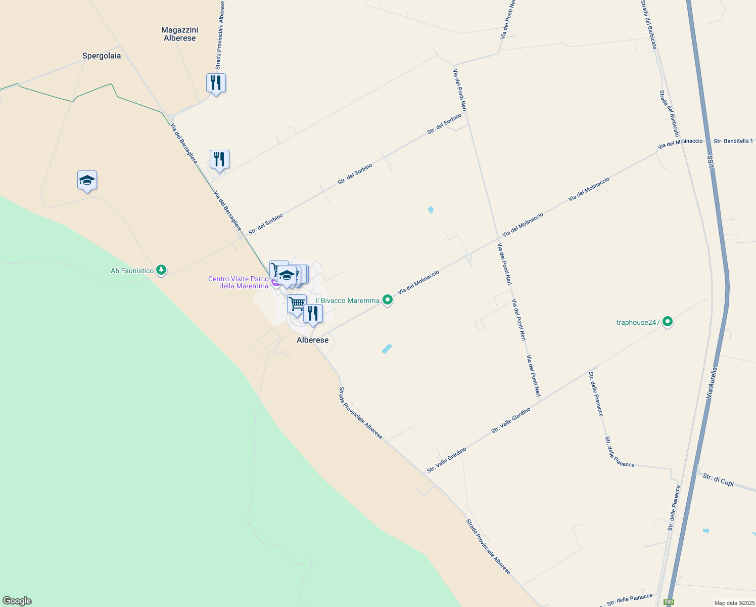 Nearby parks include Località Alberese, Giardino Pubblico and Giardino Pubblico Piazza del Combattente.