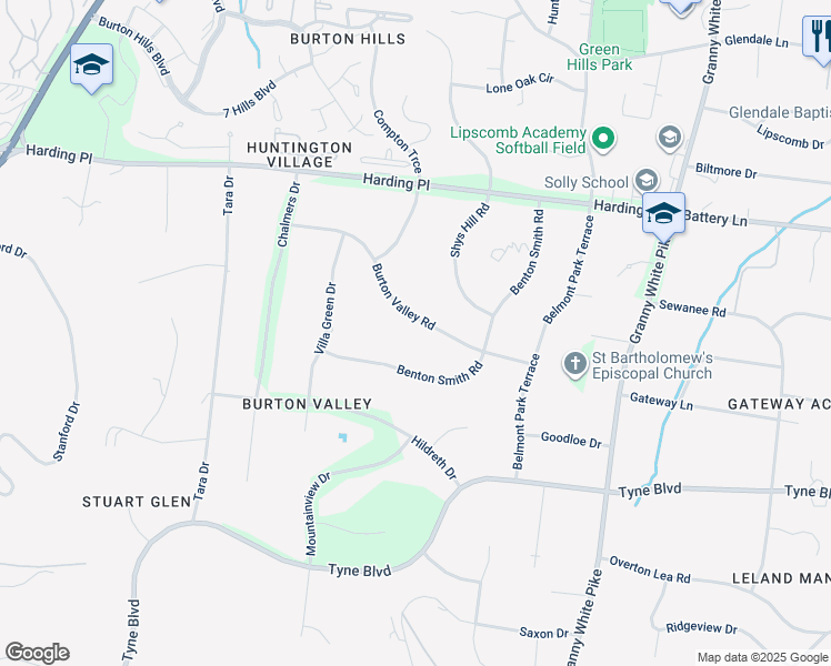 This location is in the Burton Valley neighborhood in Nashville. Nearby parks include Green Hills Park and Dugan Field.
