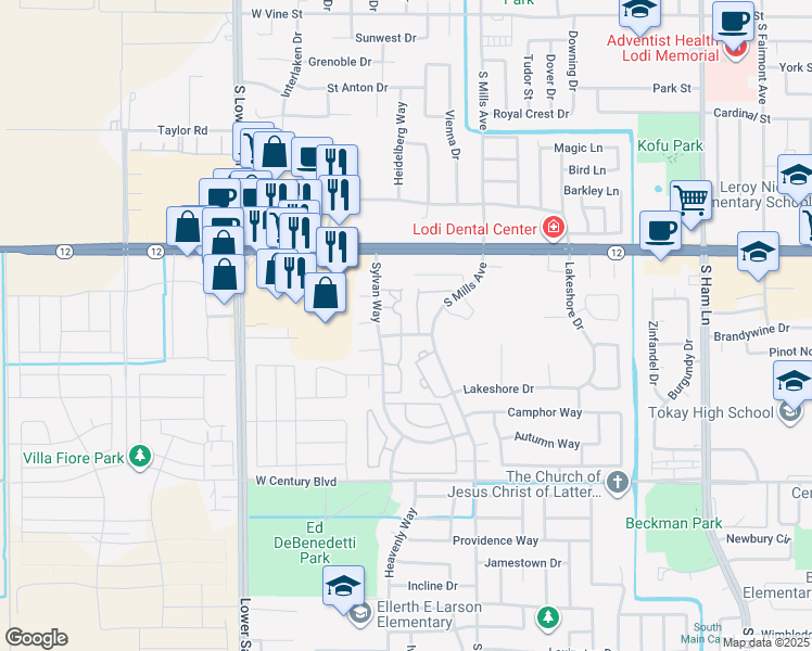map of restaurants, bars, coffee shops, grocery stores, and more near 1516 Sylvan Way in Lodi