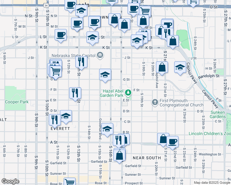 map of restaurants, bars, coffee shops, grocery stores, and more near 1617 F Street in Lincoln