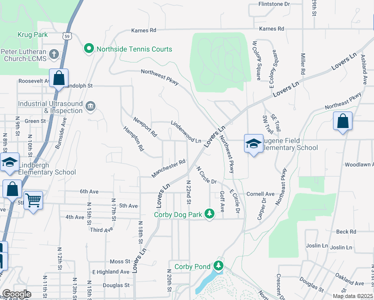 map of restaurants, bars, coffee shops, grocery stores, and more near 2510 North 22nd Street in Saint Joseph
