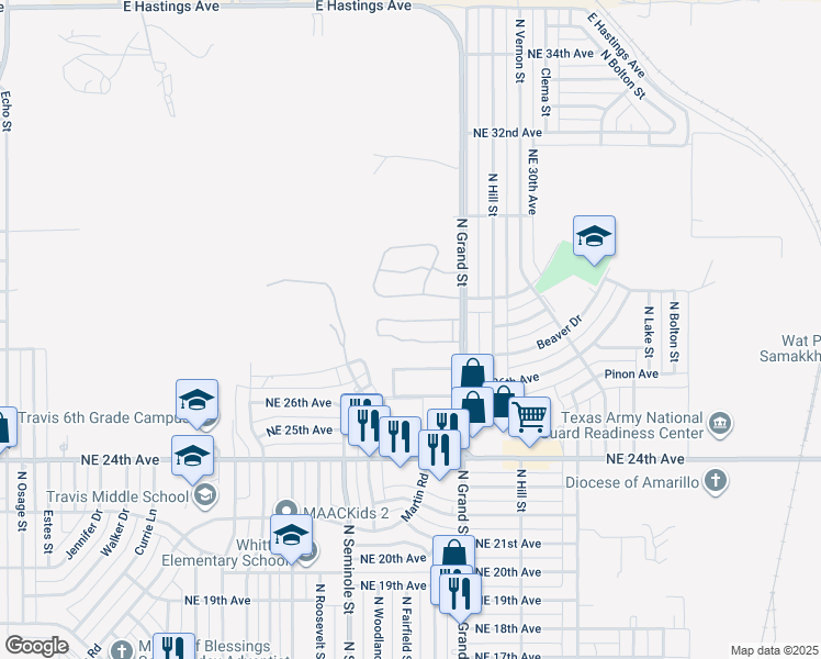 map of restaurants, bars, coffee shops, grocery stores, and more near 2701 North Grand Street in Amarillo