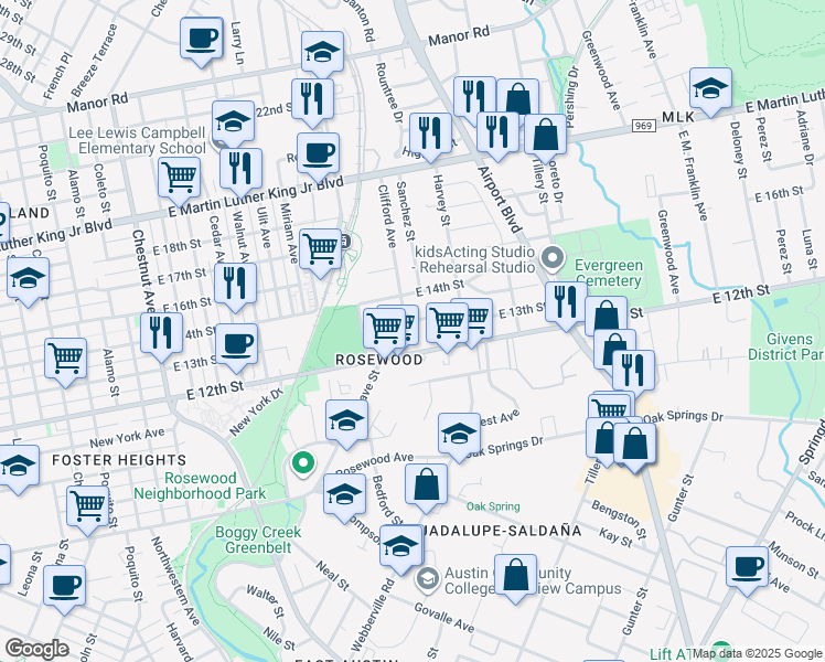 This location is in the Rosewood neighborhood in Austin. Nearby parks include Downs Park, Boggy Creek Greenbelt and Boggy Creek Greenbelt.
