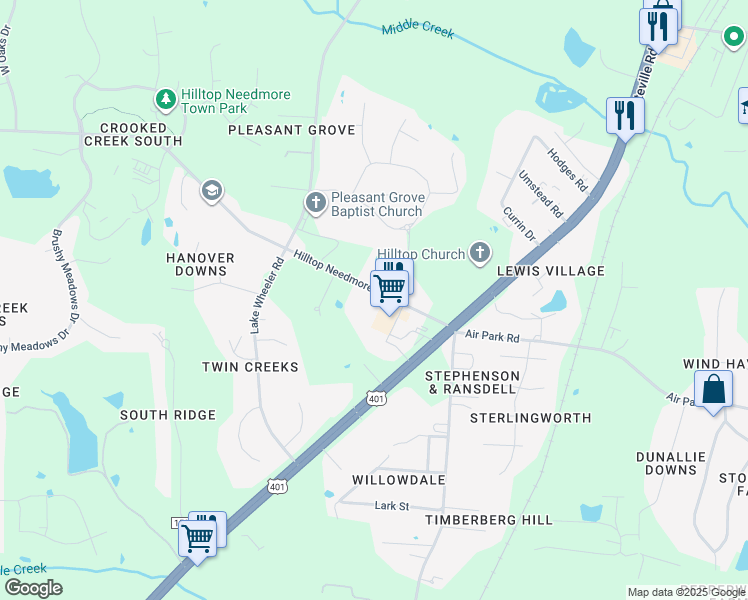 map of restaurants, bars, coffee shops, grocery stores, and more near 4001 Hilltop Needmore Road in Fuquay Varina