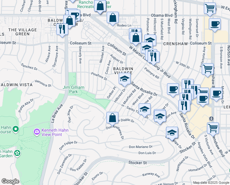 This location is in Los Angeles. Nearby parks include Jim Gilliam Recreation Center, Kenneth Hahn State Recreational Area and Rancho Cienega Recreation Center.