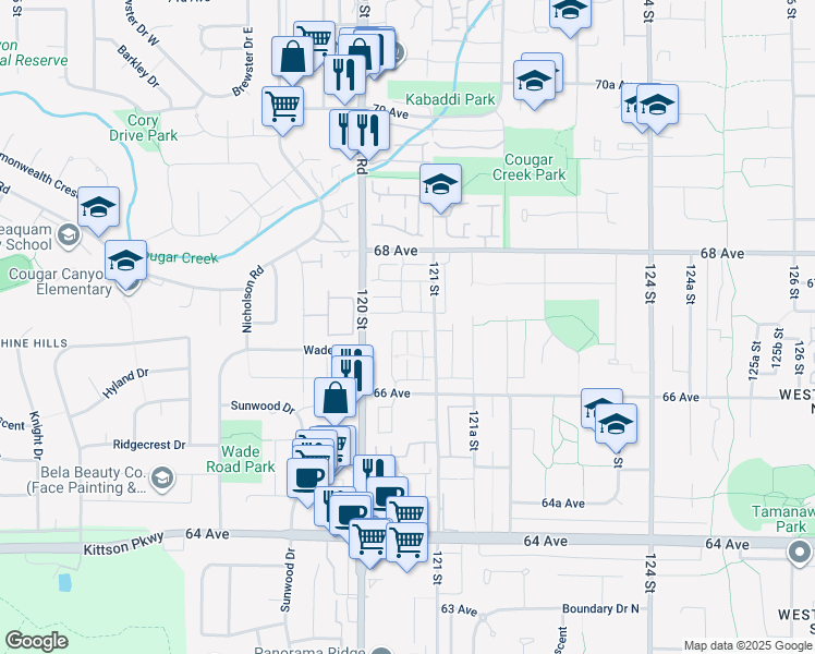 map of restaurants, bars, coffee shops, grocery stores, and more near 6671 121 Street in Surrey