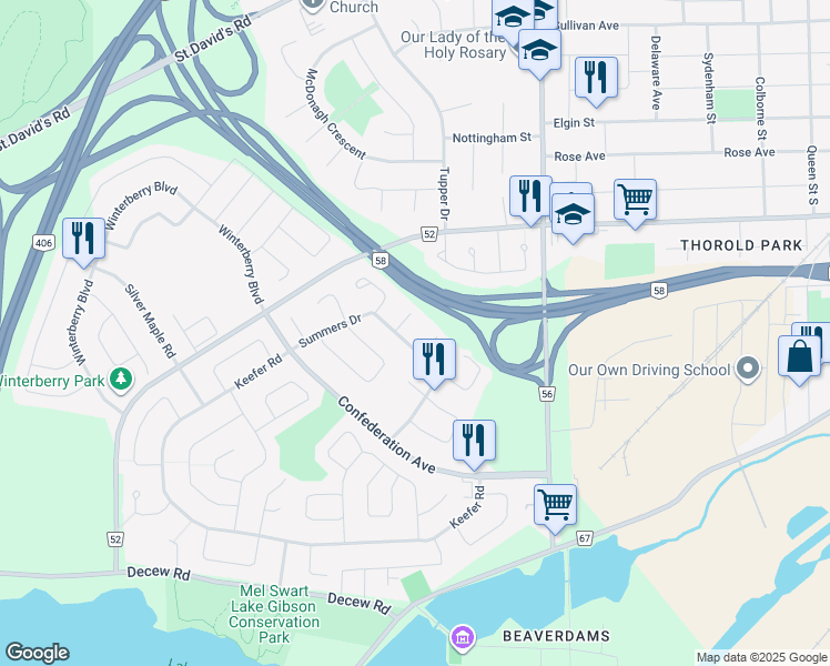 This location is in Thorold. Nearby parks include Lake Gibson Recreation Area and Beaverdams Park.