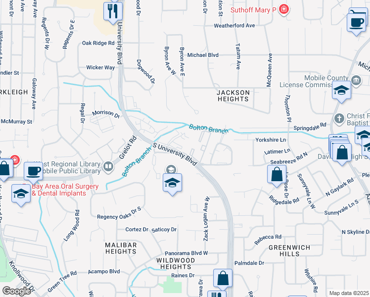 map of restaurants, bars, coffee shops, grocery stores, and more near 833 South University Boulevard in Mobile