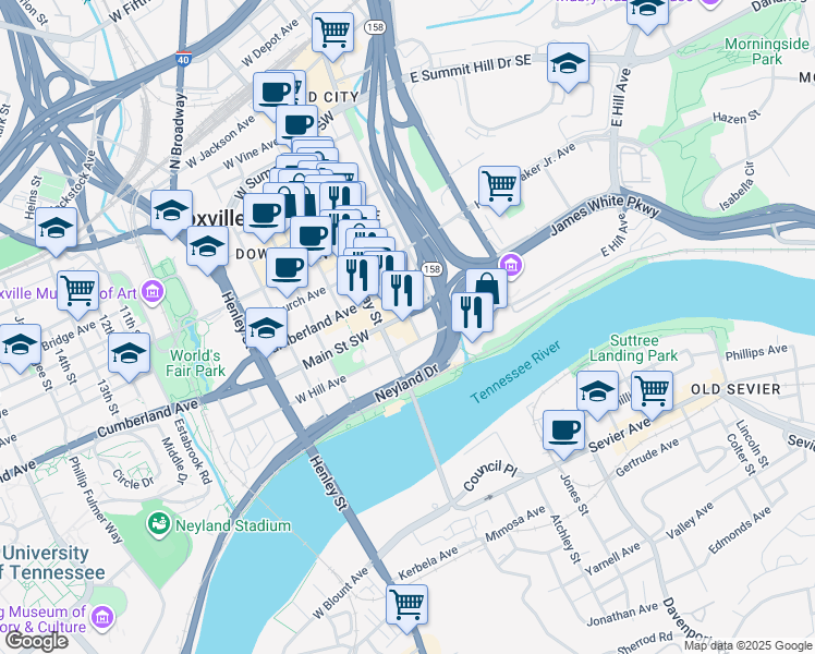 map of restaurants, bars, coffee shops, grocery stores, and more near 900 South Gay Street in Knoxville