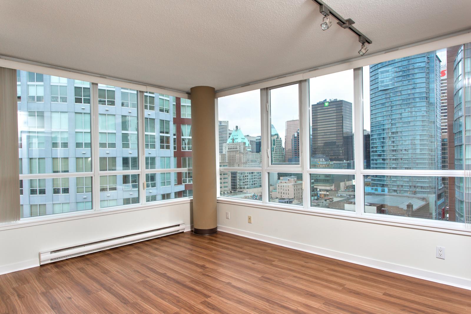- Two concrete high-rise towers in the heart of Downtown Vancouver, with shops and services at your front door without even having to leave the building;