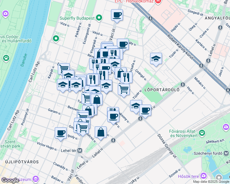 Nearby parks include Dráva park, Tüzér park and Duna Terasz.