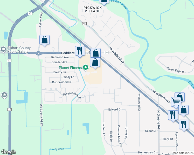 map of restaurants, bars, coffee shops, grocery stores, and more near 2932 Elkhart Road in Goshen