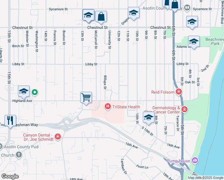 map of restaurants, bars, coffee shops, grocery stores, and more near 1220 Highland Avenue in Clarkston