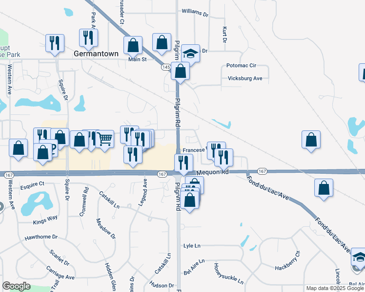 map of restaurants, bars, coffee shops, grocery stores, and more near N113W15570 Francese Drive in Germantown