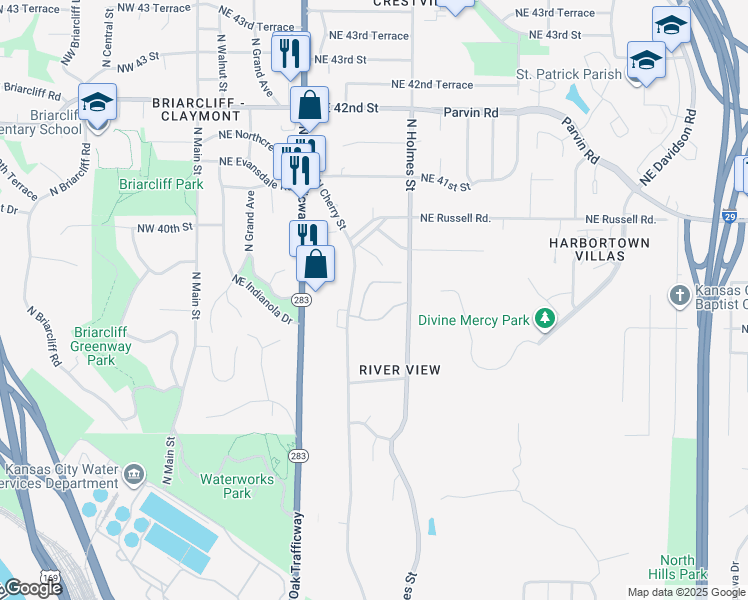This location is in the River View neighborhood in Kansas City. Nearby parks include Briarcliff Park, Waterworks Park and Riverview Park.