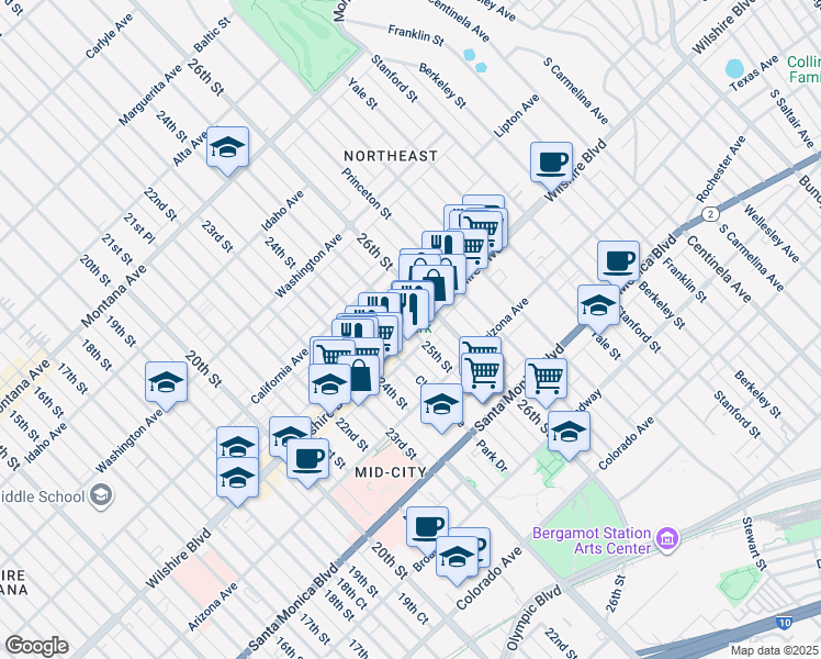 Wilshire Blvd & 25th St is in the Northeast Santa Monica neighborhood. Northeast Santa Monica is the 6th most walkable neighborhood in Santa Monica with a neighborhood Walk Score of 79.